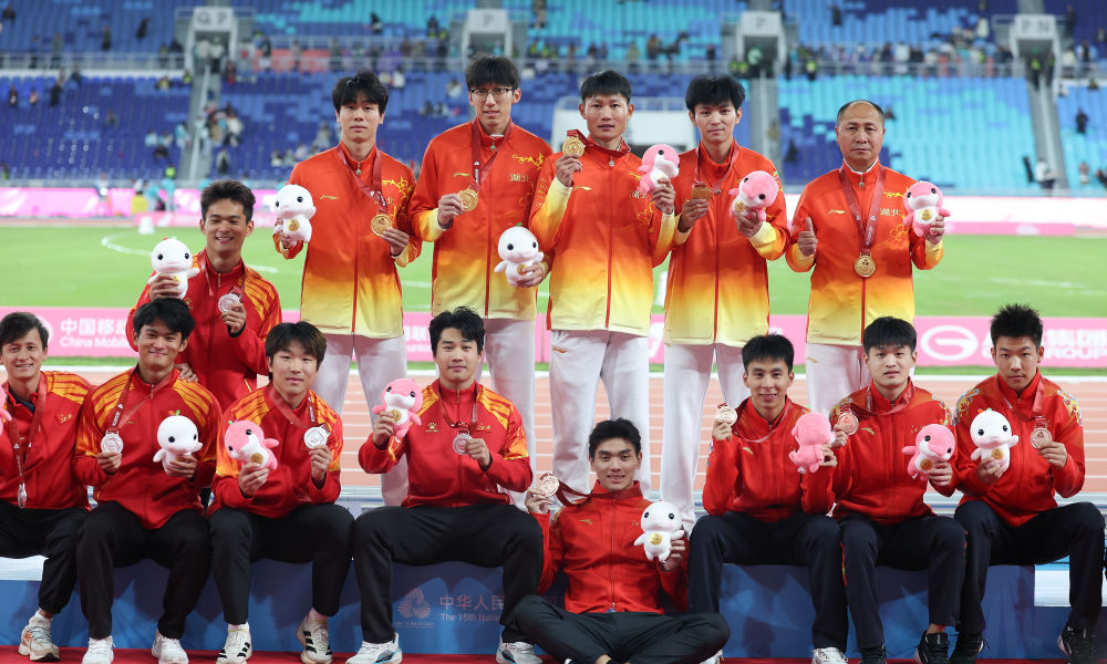 11月20日,在广州举行的第十五届全运会田径项目男子4×100米接力决赛中,湖北队获得冠军,江西队、江苏队分别获得亚军和季军。 ↑ 冠军湖北队选手(上)、亚军江西队选手(前左)、季军江苏队选手(最右)在颁奖典礼上与教练合影。新华社记者黄伟摄↑冠军湖北队队员李泽阳(左)与季军江苏队队员隋高飞在颁奖典礼上合影。新华社记者周牧 摄↑湖北冠军球员在颁奖典礼上与教练合影。新华社记者 黄伟 摄 ↑江西队球员在颁奖典礼上与教练合影。新华社记者 黄伟 摄 ↑江苏T队球员获得第三名的队伍在颁奖典礼上与教练合影。新华社记者黄伟摄↑湖北队球员刘洋(右)赛后庆祝。新华社记者邓华摄↑湖北队球员刘洋(右)赛后庆祝。新华社记者邓华摄↑广东队球员苏炳添赛后向观众致意。新华社记者姜瀚摄↑广东队球员苏炳添赛后向观众致意。新华社记者姜瀚摄↑广东队球员苏炳添赛后向观众致意。新华社记者姜瀚摄↑广东队球员苏炳添赛后向观众致意。新华社记者姜瀚摄↑广东球员刘洪熙(左)与队友石俊豪赛后拥抱。新华社记者邓华摄↑广东队球员苏炳添致辞比赛结束。新华社记者邓华摄↑广东队球员苏炳添赛后致辞。新华社记者邓华摄↑广东队球员苏炳添赛后致辞。新华社记者黄伟摄↑广东队球员苏炳添赛后脱下跑鞋。新华社记者黄伟摄↑广东队球员苏炳添赛后。新华社记者黄伟摄↑广东队球员苏炳添赛后跑鞋脱落。新华社记者姜瀚摄↑广东队球员刘洪熙、苏炳添、石俊豪、陈冠峰(从左至右)赛后。新华社记者姜瀚摄↑广东队球员苏炳添(左一)赛后。新华社记者李艺博摄↑广东队球员苏炳添在比赛中。照片新华社记者 邓华 ↑ 比赛较量。新华社记者邓华摄↑广东队球员苏炳添在比赛中。新华社记者 邓华 摄 ↑ 比赛较量。新华社记者黄伟摄↑广东队球员苏炳添在比赛中。新华社记者黄伟摄↑广东队球员苏炳添在比赛中。新华社记者黄伟摄↑广东队球员苏炳添在比赛中。新华社记者 黄伟 摄 ↑比赛较量。新华社记者周牧 摄↑广东队球员苏炳添赛前。新华社记者邓华摄↑广东队球员苏炳添、刘洪熙、石俊豪、陈冠峰(从右)赛前。新华社记者 李艺博 摄