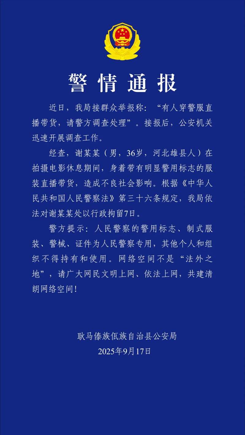 北京的消息于9月17日,Gengma Dai和WA自主县的公共安全局报告说,它最近收到了公众的报告:“有些人穿着警察制服来生存货物,请进行调查并处理。”收到报告后,公共安全器官迅速进行了调查。调查后,Xie Moumou(来自Hebei省Xiongxian的36岁的男人)穿着带有明显警察徽标的连衣裙在拍摄休息期间出售现场物品,这对社会产生了不利影响。根据中华人民共和国人民警察法第36条,Gengma Dai和WA自主县的公共安全局已根据法律在Xie Moumou施加了行政拘留7天。根据以前的媒体报道,在9月10日上午,“加西Xie Mengwei”是公开警察制服,同时在在线平台上播出。编辑Jia Congcong