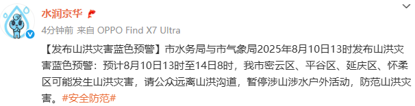 北京新闻据Shuirun Jinghua Weibo,北京市政水务局和市政气象局的新闻发布,于2025年8月10日在13:00发布了山洪流灾难的蓝色警告:Yanq和Ahejing的Huairou地区。请远离山洪流,暂停涉及山脉和水的外部活动,并避免山河。编辑李Yilinzi